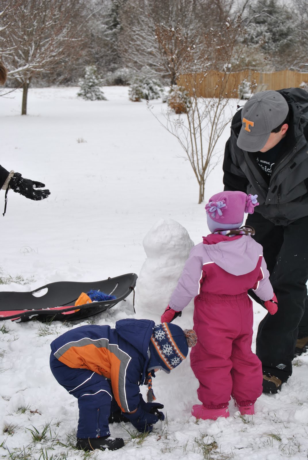 So Saturday came around and, well, remember that statement about how we didn't have any parties to go to - WRONG. You ended up getting invited to a birthday party for a little boy at school AND Daddy got invited to a work party later that afternoon. Well, we decided early on that the birthday party was not going to work out because it was at a jumpy house place and, well, no way you could control yourself there! So we didn't go to that. But by the time the afternoon party came around, both Mommy and Daddy needed a break from this whole potty training gig. Yes, you continued to hold it and cry and hold it and cry. I think you ended up going in the potty that day. Yes, as a matter of fact, you did both! And we were so proud (this was before nap). So off to nap (with no diaper, I might add!) you went. After nap, Daddy made the executive decision (against Mommy's will) to put you in a diaper to go to this work party. Something about cleaning up a mess on their marble floors or something... So, we did and you had such a good time playing with all the kiddos there. We decided to go out to dinner, since we were already out (can you tell we were dreading getting back home and dealing with the potty training??!!) and, well, you weren't the best, let's just keep it at that. We decided to get you home and in bed and start fresh on Sunday. Let me just say, the reason we were so relaxed (for Daddy and me) about this was because we knew you were going to school on Monday and were going to go all week. So we were going to hand the reins over to them. So, Sunday comes and we spend all day in the house. We try and try and try all different approaches to getting you to go, but you refused for hours on end and then at the last minute, would go. Problem was, that literally, you went 2 times on Sunday. 2 times! All day! Once before lunch and the other that afternoon, right before bedtime. And you were 50/50. So, yes, I can't complain about having to clean up messes and stuff but man alive you NEEDED to go like 8 times, you just wouldn't, so we'd have to just watch you come up with clever ways of 'holding it'. Such as...1) asking Mommy or Daddy to hold you. Some reason this stopped the pressure... 2) Physically holding it yourself. Yes, this was not pretty. 3) Sitting on the floor or table. You figured out that if you stand up, the pressure is more intense, so if you had to go get something, you'd just scoot along on the floor rather than walking to it. Clever baby girl, but so annoying. At this point, all I could think of was Monday can't come soon enough. But it did... And so did the massive amount of snow. Like 5+ inches. And, guess who was closed? Yep, your school. UGH!!!! Well, at this point, Mommy and Daddy both were just going with the flow. If you wanted to sit on the potty, sit on the potty, if you wanted to run around and hold yourself, do it! Just get us through the day without losing our minds!! Eventually, we decided we wanted to play in the snow, and that we wanted to play with Ryan in the snow, so off we went to the Grugett's house! And, just because I know you are wondering, we did put a diaper on you. AND, just because I know you are wondering, you did NOT go in the diaper - at all. The whole 2 hours in the snow and you didn't go in your diaper. And hadn't gone all morning. Holding it. ALL THE TIME. Regardless of the situation. So frustrating!!! But, thankfully we all forgot about it for a couple hours...
